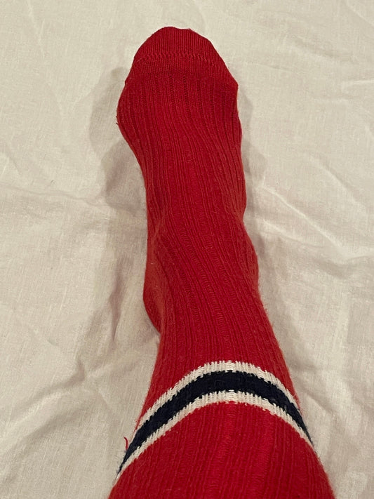 Size L - Vintage Cross-Country Ski Wool Knicker Socks - Red with Blue and White Stripes - 1960s