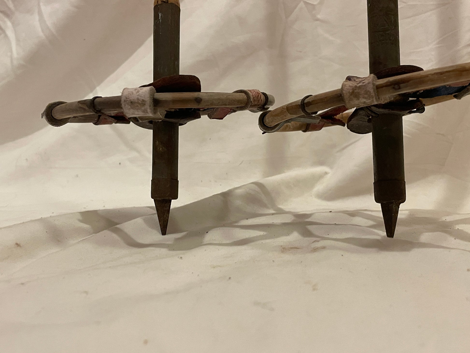 These "no name" Finnish cross-country ski poles will fill you with American pride with their red, white, and blue leather baskets. No, I'm sure that has nothing to do with why the baskets are those colours, but it's pretty neat. The poles are in good shape, given their age - they likely hail from the late 1950s or early 1960s based on the materials used and how the handles and baskets are constructed. Normally Finnish poles of that era would have a branding on the inner pole strap, but hey, the straps on these bit the dust a while ago. The straps would need to be replaced if they were going to be used as ski poles going forward.