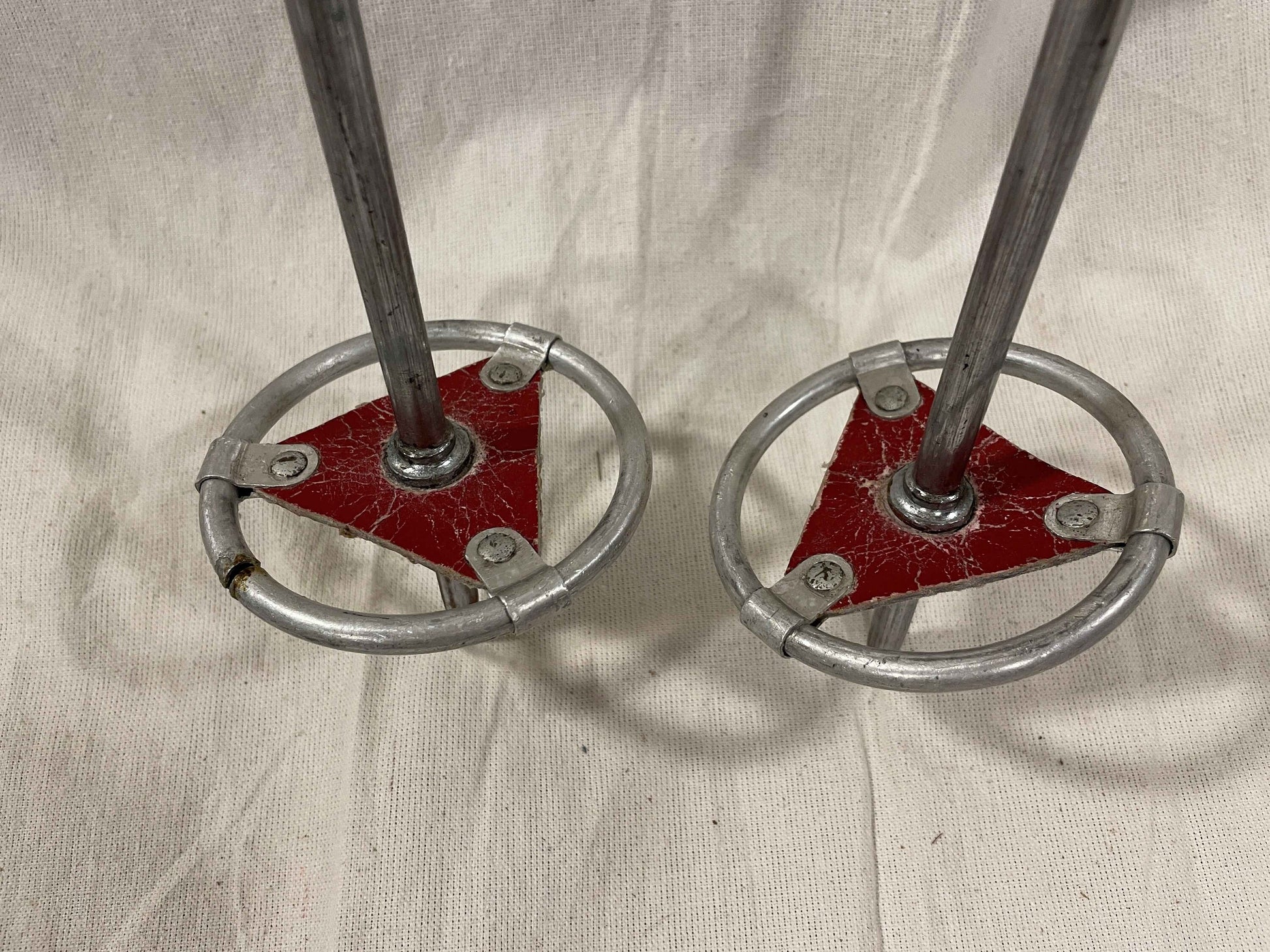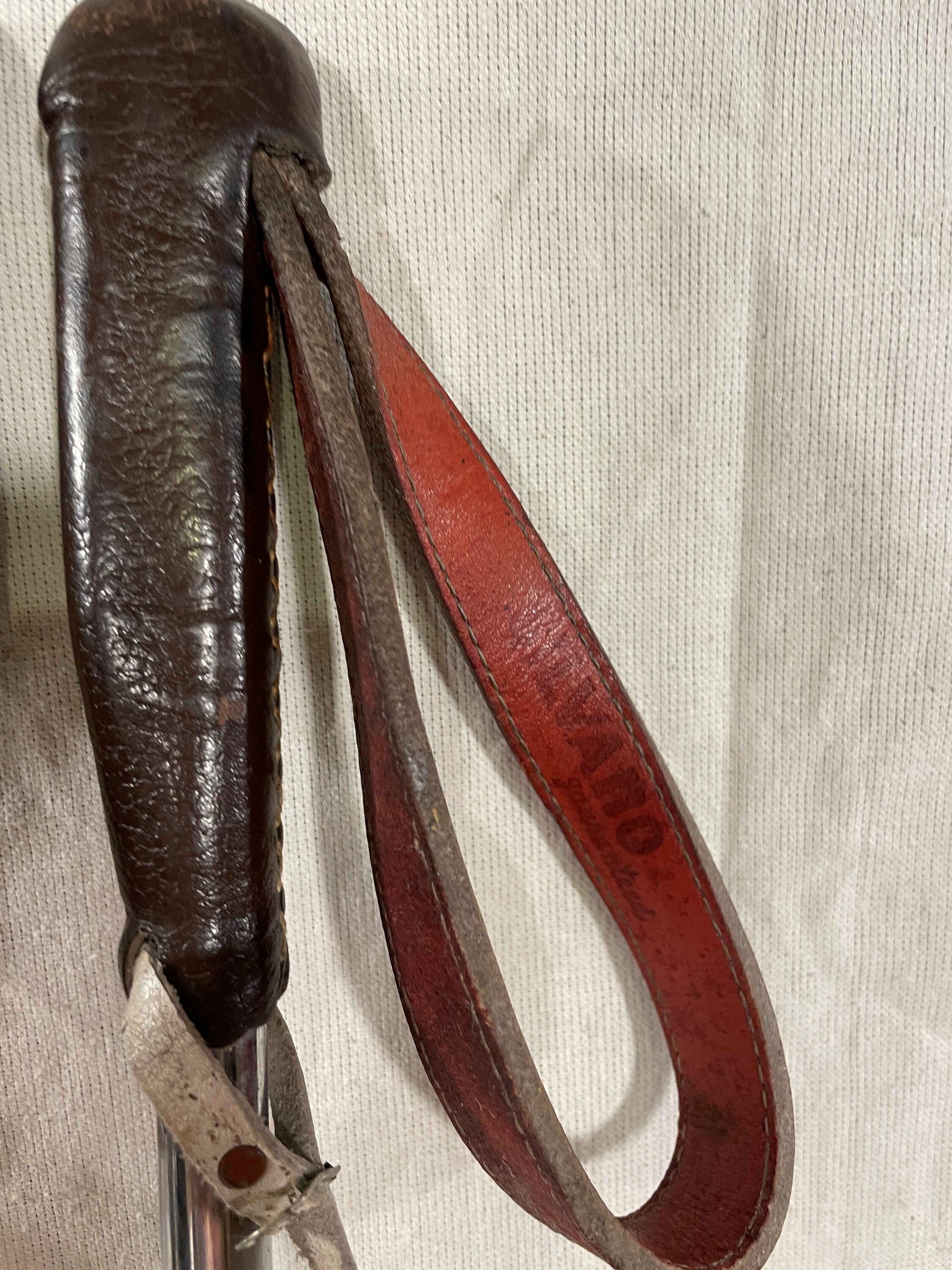 Unique pair of cross-country ski poles. Says "Silvaro" on inside of strap, but I can't find any information on this brand. They are long for the era - at 155cm/61in they would have been used by someone well over 6ft tall. Until recently, pole size was determined by where the top of the pole handle measured against the armpit. The straps are a solid leather, more bulky than other leather straps of the day. Overall a very attractive pole.