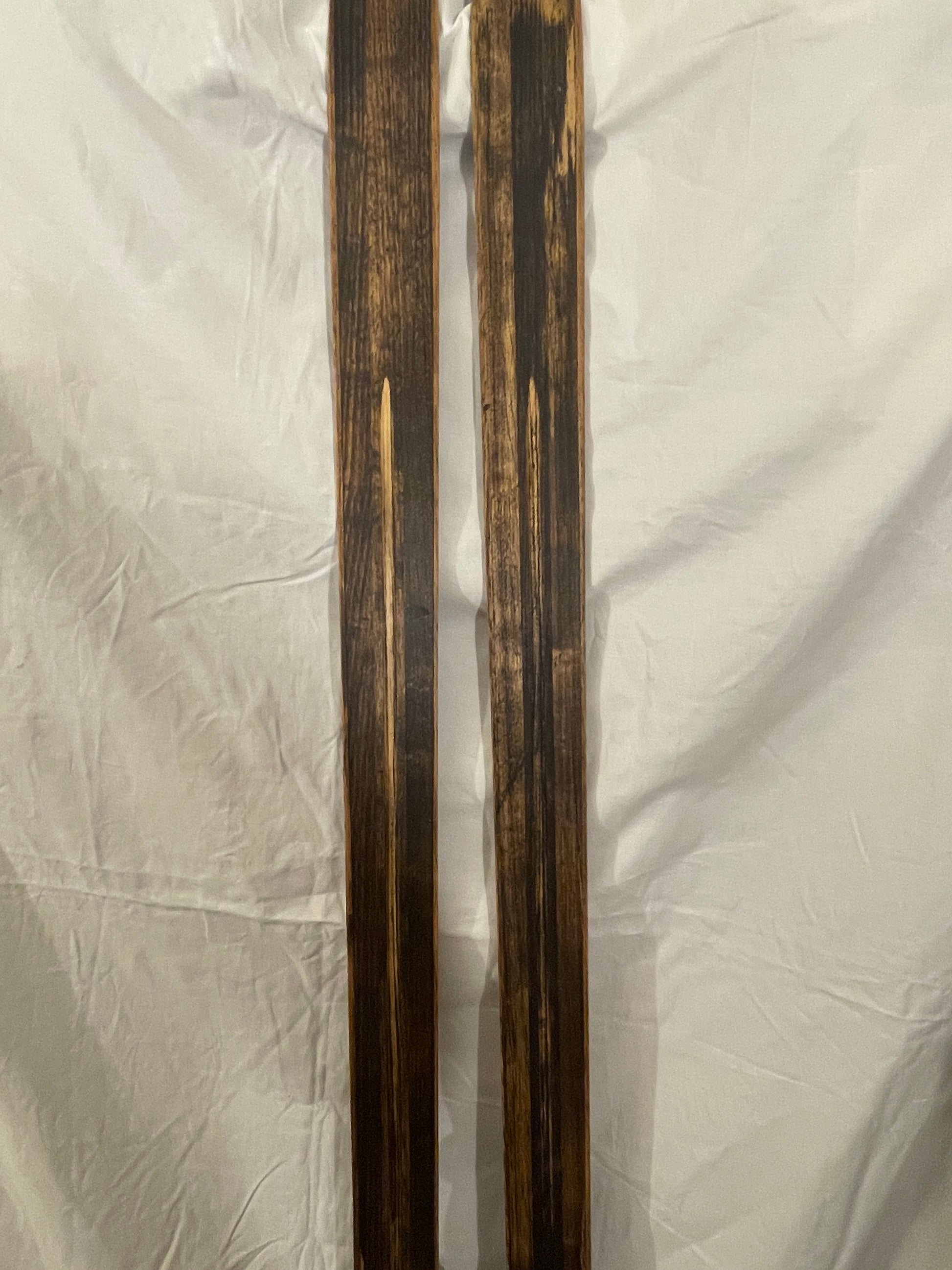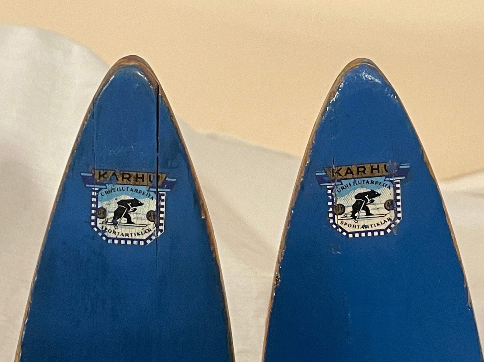This pair of skis hails from the mid 60s. It's seen a lot of use, but the experts at Skifabrikk have worked their magic to clean up the tops and bases. In addition, over the years these skis have been touched up and repaired, so you may notice some slight color differences on the paint. But the logos are in great shape, and the skis have been protected by a coat of satin urethane. The bases have been scraped, sanded, glued, and tarred. Not new, but in way better shape than when they were found in Suomi.