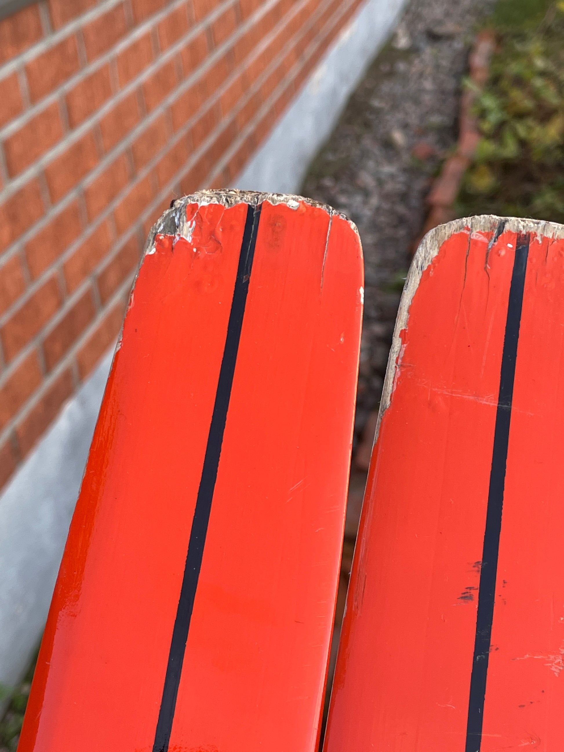 This example, despite the very Norwegian name "Loipe", was made in Finland. Regardless of their origin, these skis flash classic early 70s orange and royal blue. Never mounted with bindings, and bearing original informational stickers. They would look pretty groovy next to your lava lamp and your velour sofa.