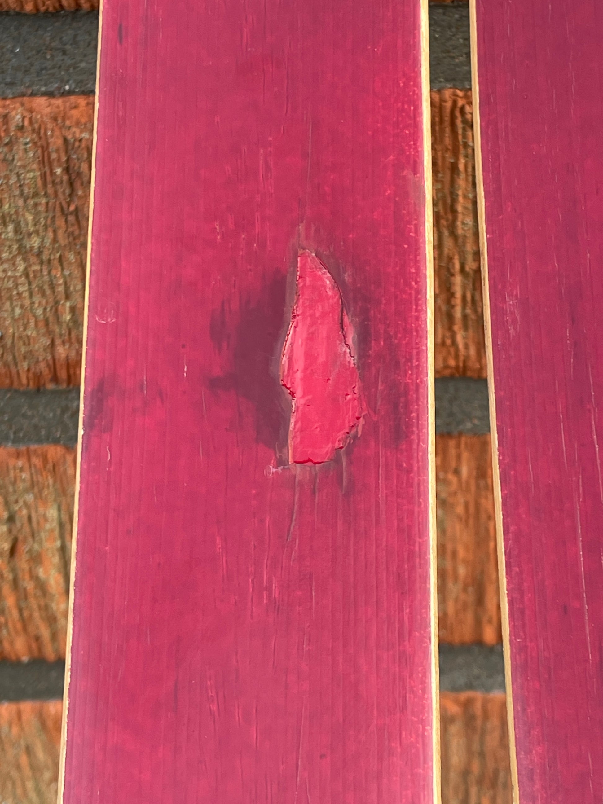 There is one owie, which you can see in the photos - a spot on the surface where the original paint has chipped off. This has been cleverly repaired by the folks at Skifabrikk with an auto touch-up pen (they are very handy in the trade).