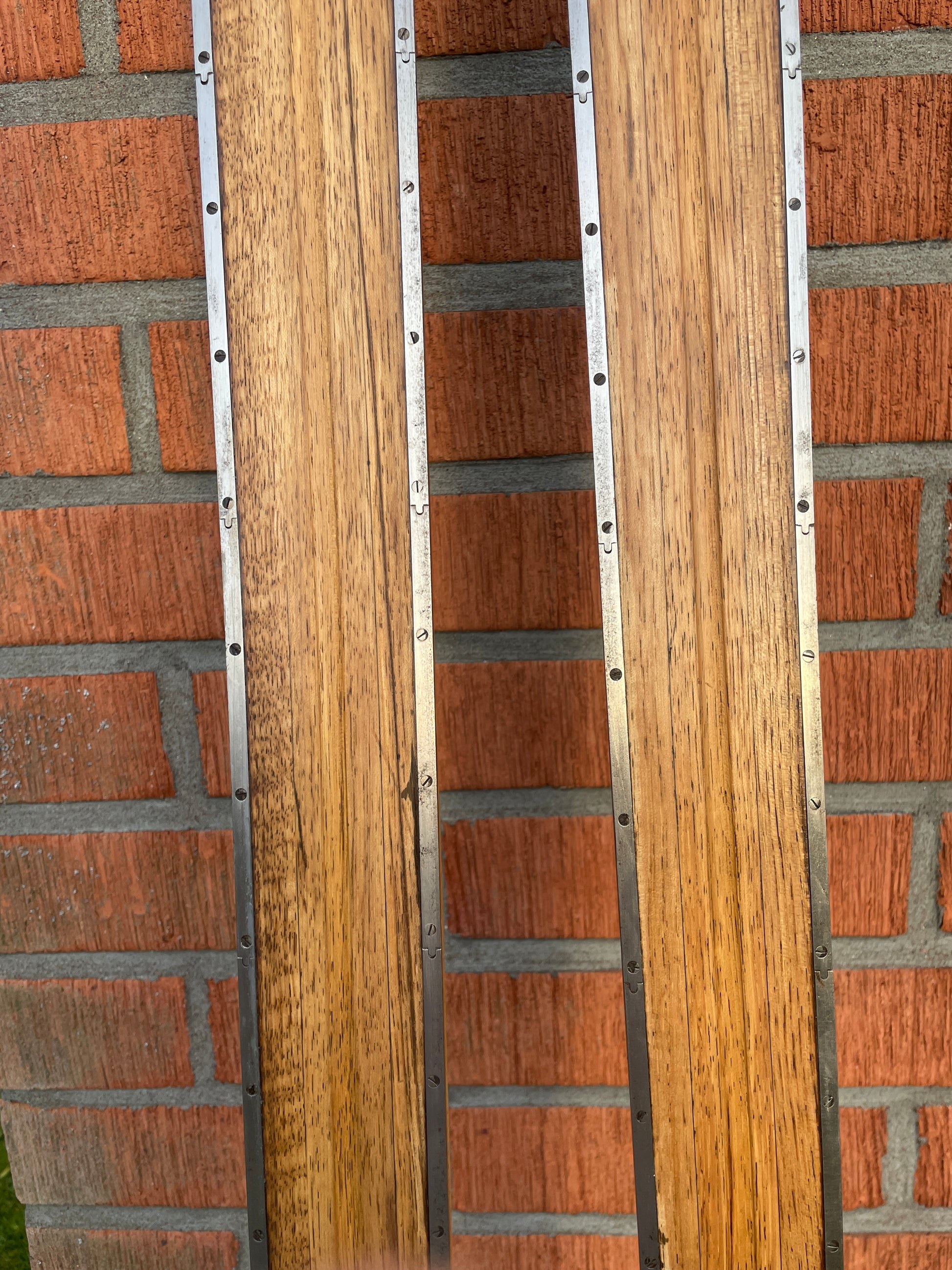 Now they are ready for their next adventure. The paint on the tops has been refreshed, but not at the expense of the beautiful original logos. The bases are in great shape and the edges are intact. Rear-clamp "NATO"-style bindings preferred by the military allow these skis to be used with a wide range of footwear.