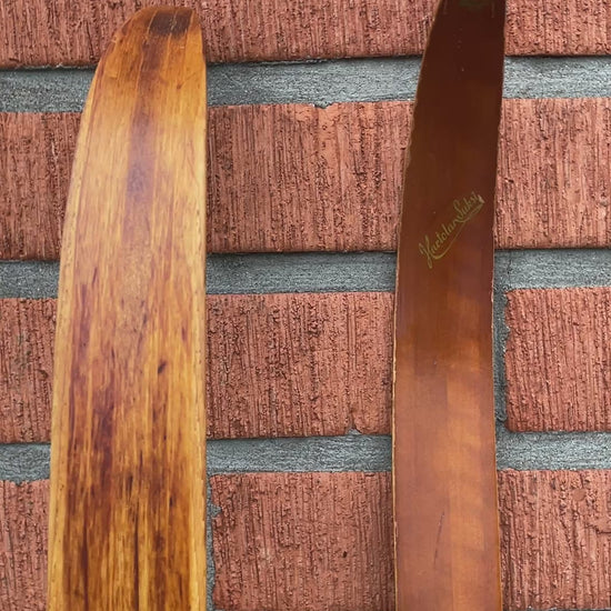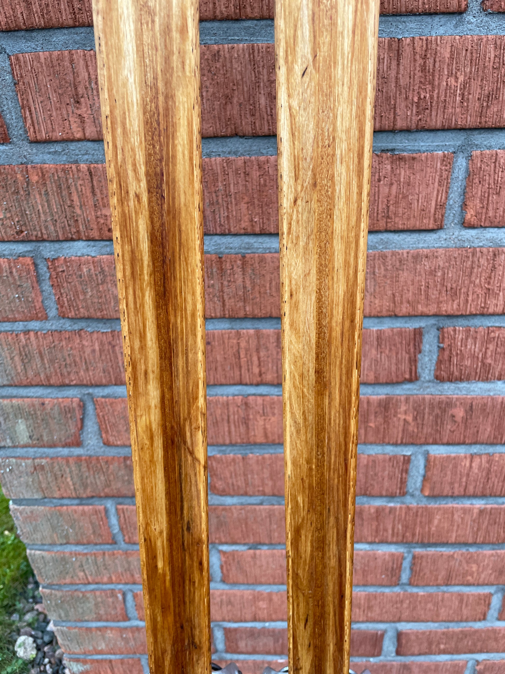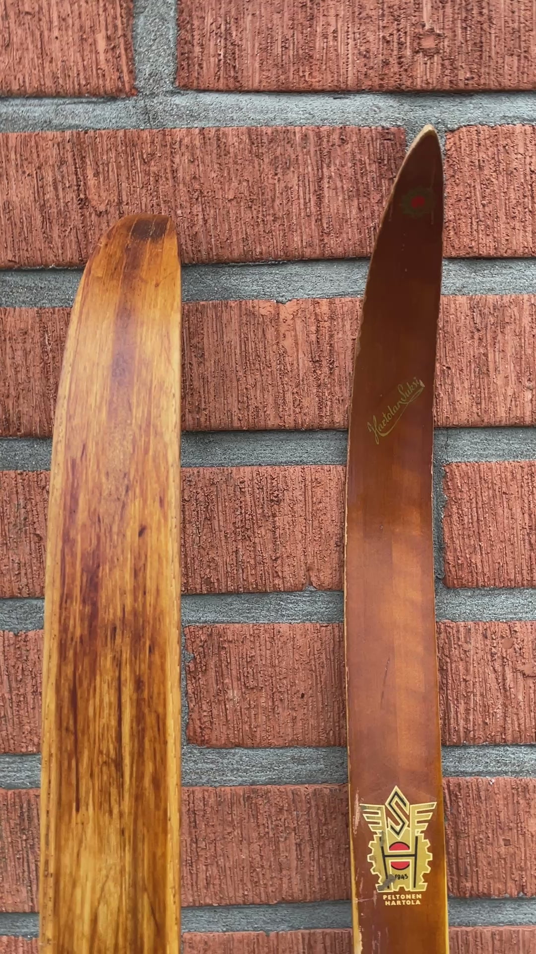 HIGHLY desirable birch base, hickory edge PELTONEN Erikoiskilpa ("Special Racing") cross-country skis. So why are these in the BARGAIN BIN!!!? Because one of the tails has been snapped (but skillfully repaired). The story is that Moose went to pick these skis up, deep in the woods of Finland, and the nice seller handed them to him and said "oh sorry one of them is broken". Gee that would have been good to know, but who knows if Moose protested, they may not have found his antlers until spring!!!