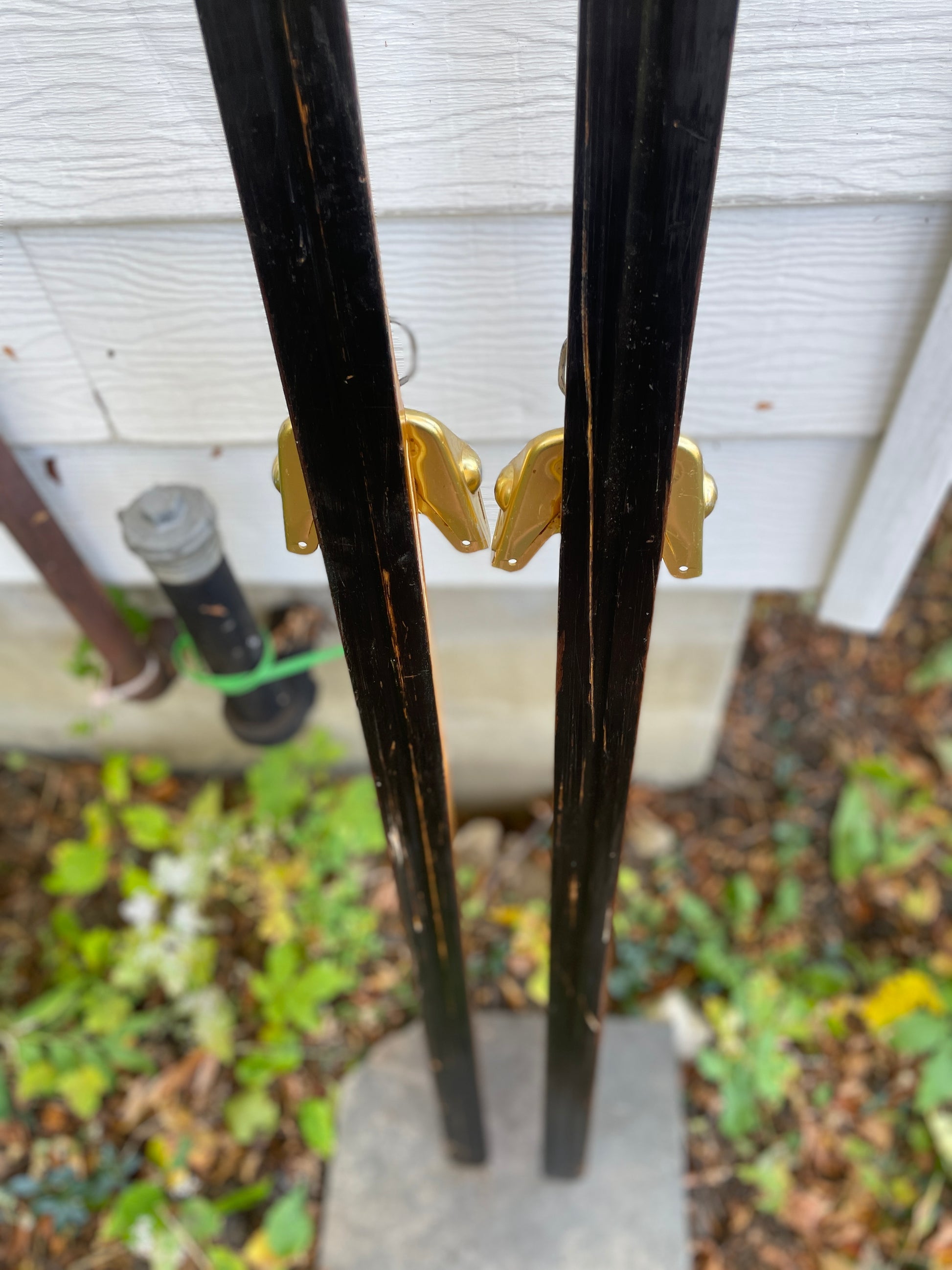 Ski nerds might debate whether these skis are "real" wood skis; by this time manufacturers were experimenting with coating the bases of skis with epoxy-base pastes that would harden and produce a more hydro-phobic surface than bare hickory or birch. Landem's was called "plastrelagt" (lit. "plastic wood") and smells like creosote if it gets too hot. Ask me how I know.