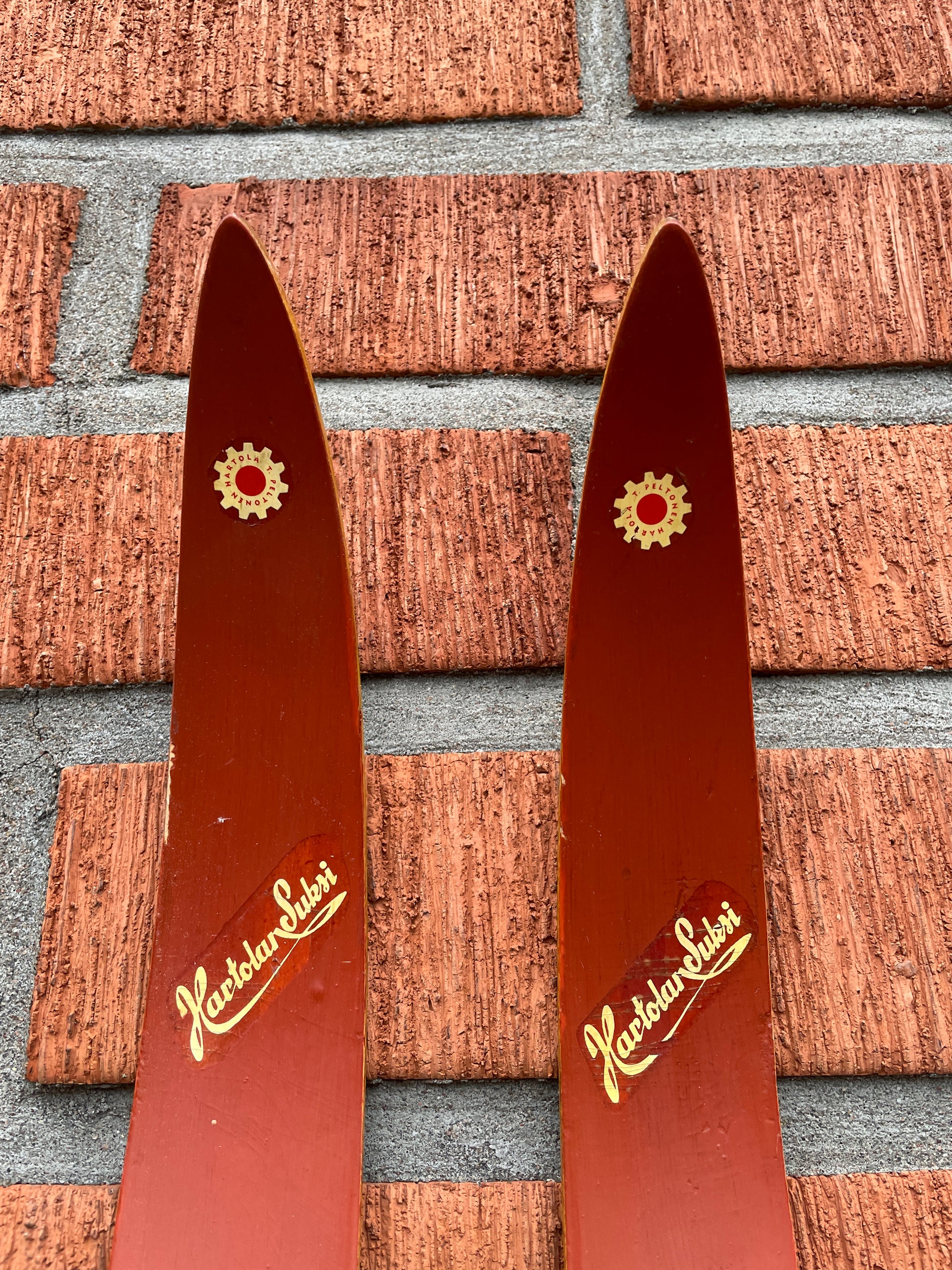 Aside from that, the decals on these skis are in good shape, and the paint has been refreshed. They look great. Karhu-brand aluminium 4-pin racing bindings give the skis a proper period look.