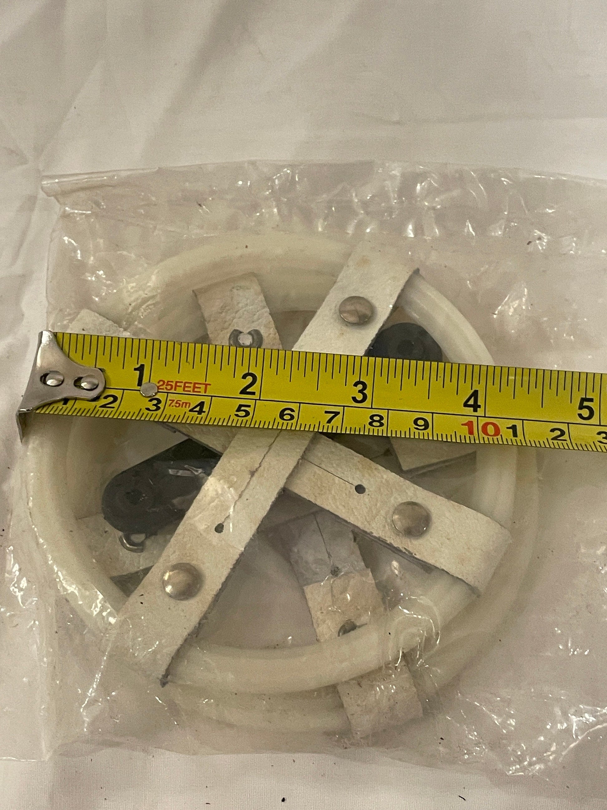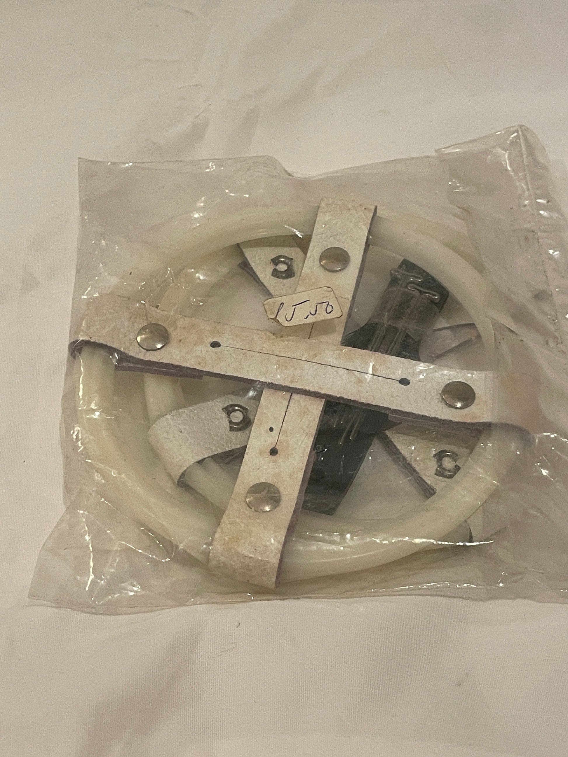 Looking to upgrade your vintage ski poles to shave seconds off your time in your next old-timer ski race? Well, stop hauling around those big, clunky wicker baskets and STREAMLINE. This pair of leather and plastic replacement baskets has all the parts to transform your poles into lightning bolts! Approx 11cm in diameter. Picked up during a recent visit to Norway.