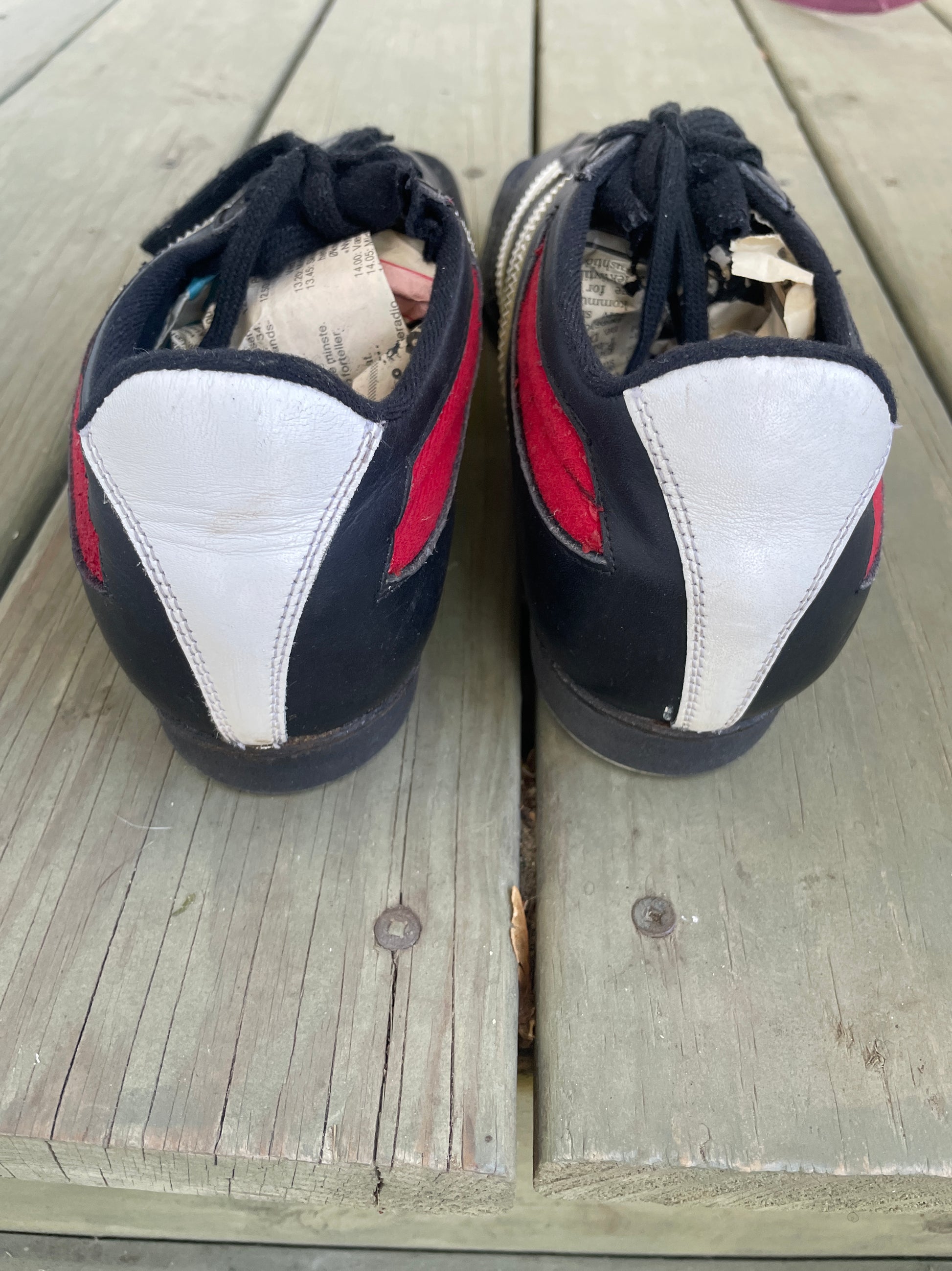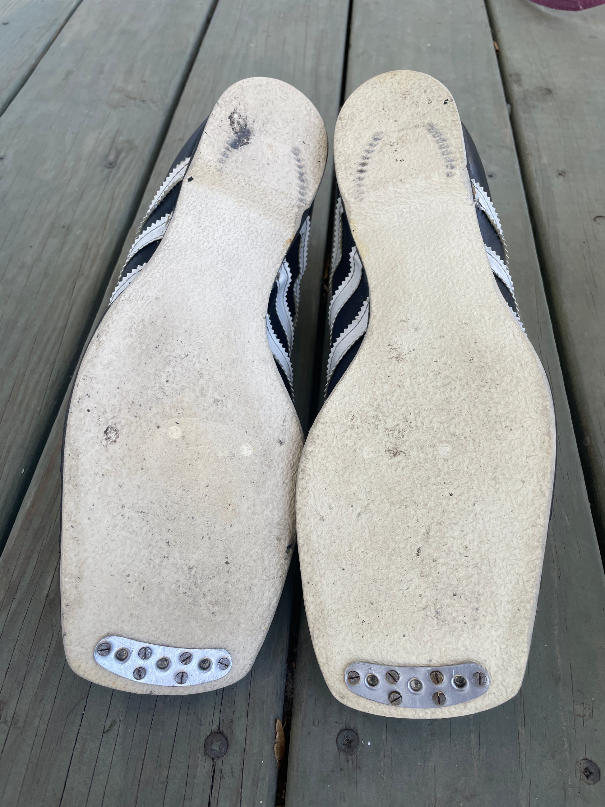 Lightly used Jette cross-country racing boots from the late 1960s. These are HARD TO FIND. And, especially in such good shape. Size 43 is about a US men's 9.5 or 10; bear in mind that these are leather so there is some wiggle room. While the branding is Adidas, these boots were made by the Gjøvik Skofabrikk ("shoe factory") in Gjøvik, Norway (sort of between Oslo and Lillehammer). Jette was a leading brand of ski boots in Norway in the 60s and 70s, and for a spell had a license from a fledgling German sports equipment maker to use the "three stripes" markings on their products.