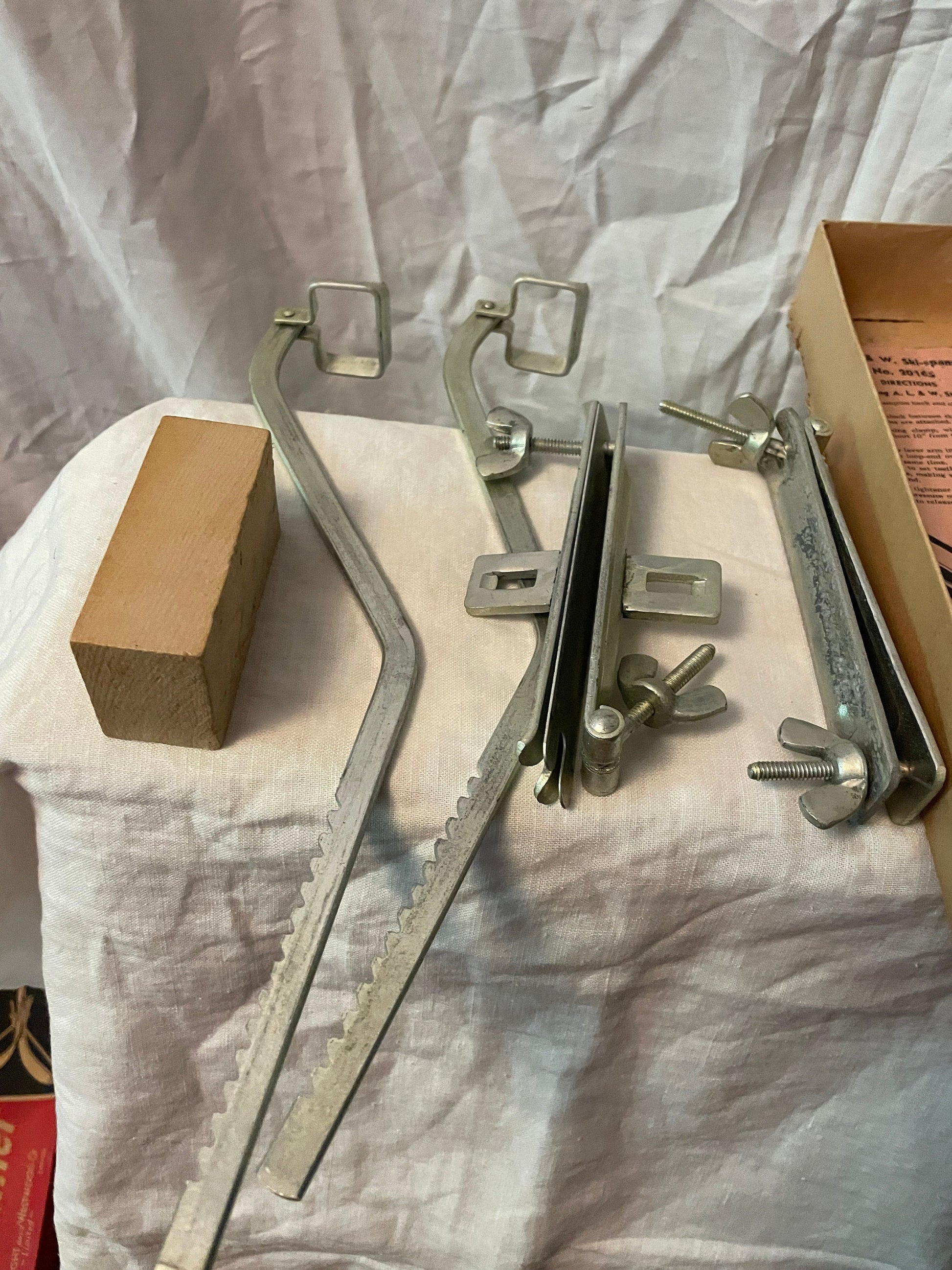 Well this hasn't happened in a while because laminated wood skis have been common since the 1950s. But back when skis were solid wood, their tips had been heated and steamed into shape, and if they weren't clamped with a gizmo like this in the off-season they would lose their curve.